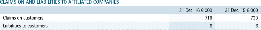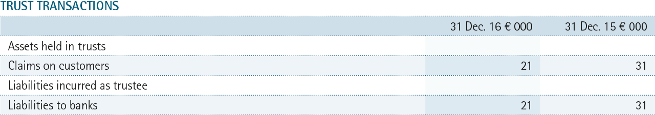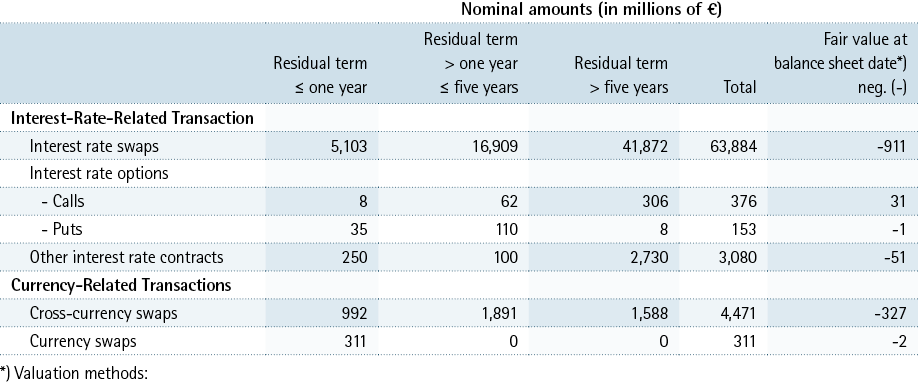 Interest attributable to derivative deals is carried under the balance sheet items “Claims on banks” with € 348.2 million (previous year € 363.0 million) and “Liabilities to banks” with € 399.2 million (previous year € 409.0 million). The accrual of compensatory payments made is entered under “Other assets” with € 11.8 million (previous year € 9.3 million); the accrual of compensatory payments received is entered under “Other liabilities” with € 65.8 million (previous year € 86.1 million).