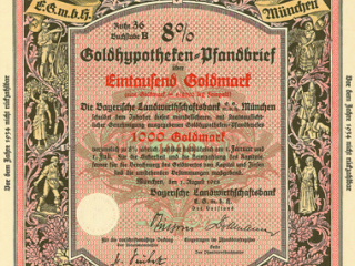 Die Bank ging bei der Emission von Pfandbriefen immer wieder neue Wege. So war sie 2014 der erste Emittent, der einen ESG-Pfandbrief begab. Damit wurde sie zum Vorreiter für nachhaltige und grüne Pfandbriefe, die seither einen deutlichen Aufschwung erleben. Bild: Ein Goldhypothekenpfandbrief aus dem Jahr 1928.