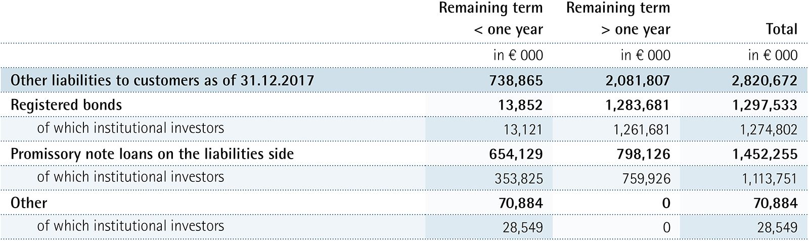 The portfolio of long-term refinancing funds increased by € 1.3 billion to € 34.1 billion, of which € 23.1 billion consisted of Mortgage Pfandbriefe, € 3.4 billion of Public Pfandbriefe and € 7.6 billion of unsecured bonds. The total volume of refinancing funds – including money market funds – increased from € 35.8 billion in the previous year to € 36.4 billion on 31 December 2017.
