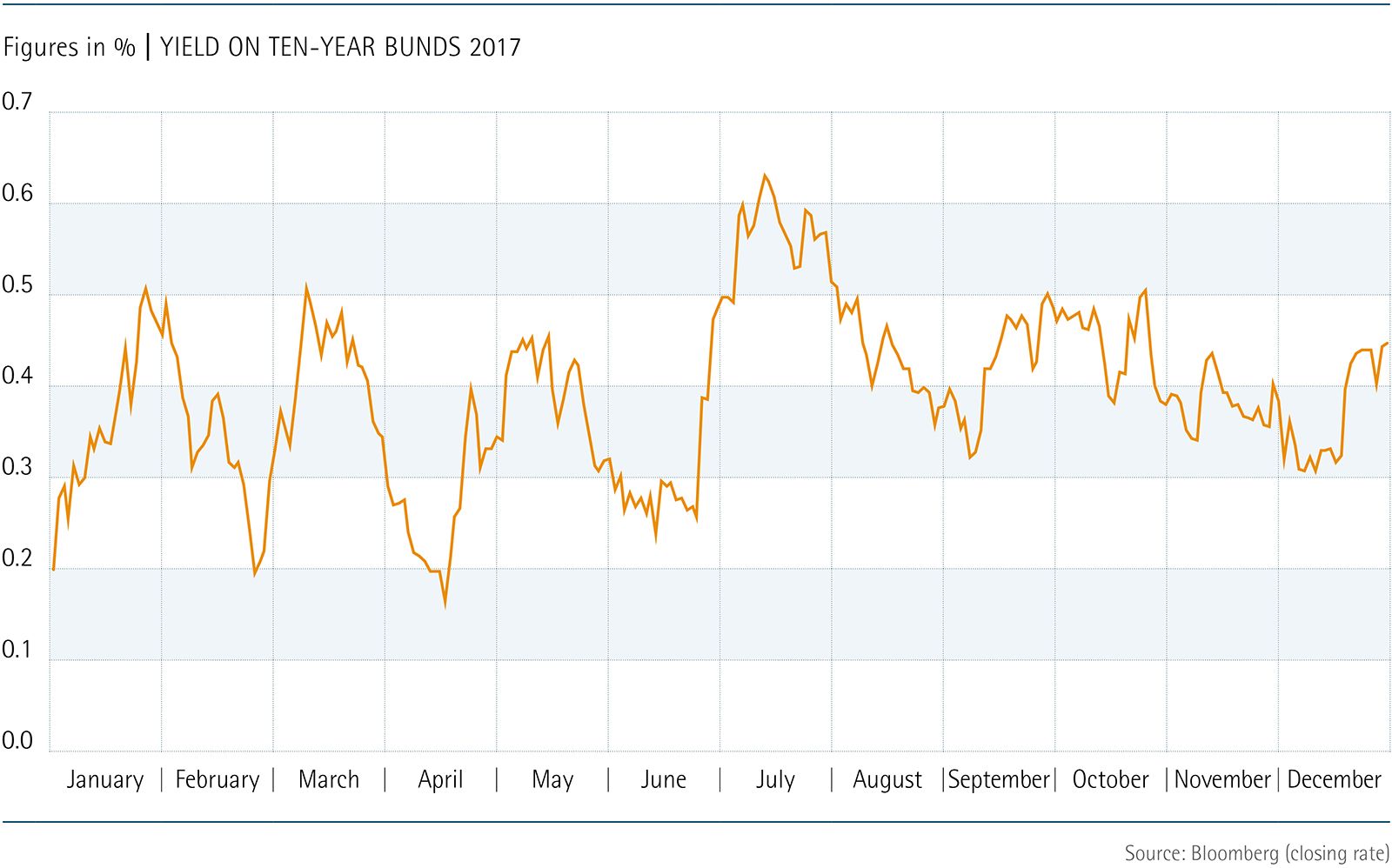 During the course of the year the European Central Bank (ECB) nevertheless retained its expansive monetary policy and left its deposit facility rate for banks unchanged at minus 0.40 percent, while its interest rate on the main refinancing operations (MRO) held steady at 0 percent. Within the framework of its asset purchase programme the net amount of monthly purchases over the course of the year amounted to 60 billion euros per month. Additional important central banks, like the Bank of Japan, the Bank of England and the Swiss National Bank, also provided expansive liquidity in support of the economic recovery process. The policy followed by the American central bank, the Federal Reserve (Fed), diverged from the other central banks as the Fed further tightened its monetary policy during the year under review and raised its key interest three times by 25 basis points each time in light of the favourable development of the American economy. At the end of 2017 the Fed’s decisions led to a federal funds rate corridor of 1.25 percent to 1.5 percent. Concurrently, the Fed began to reduce its balance sheet that had expanded due to its bond purchases.