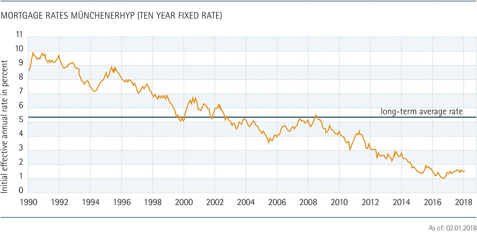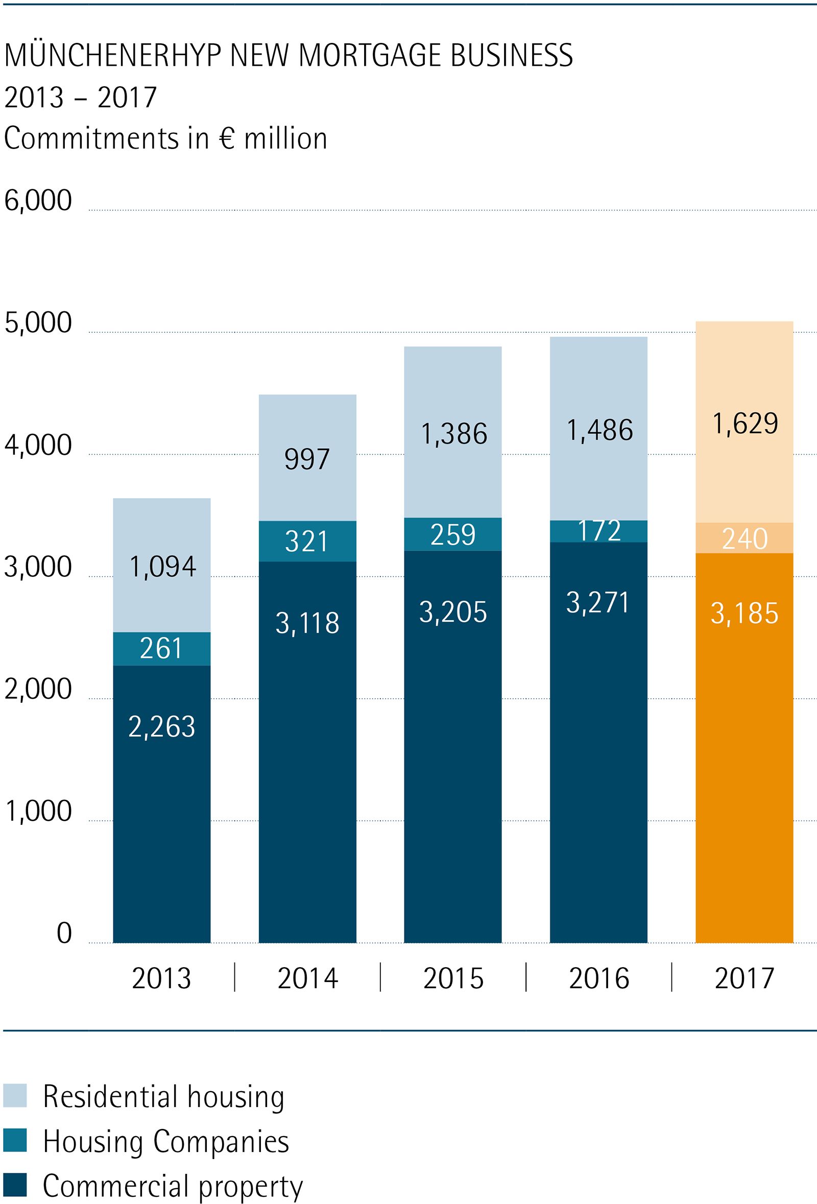 MünchenerHyp set a new record in 2017 as our volume of new mortgage business exceeded € 5 billion for the first time. Our new business grew by 2.5 percent as we made € 5.1 billion in lending commitments (previous year € 4.9 billion), thereby reflecting a slightly faster pace of growth in our business.