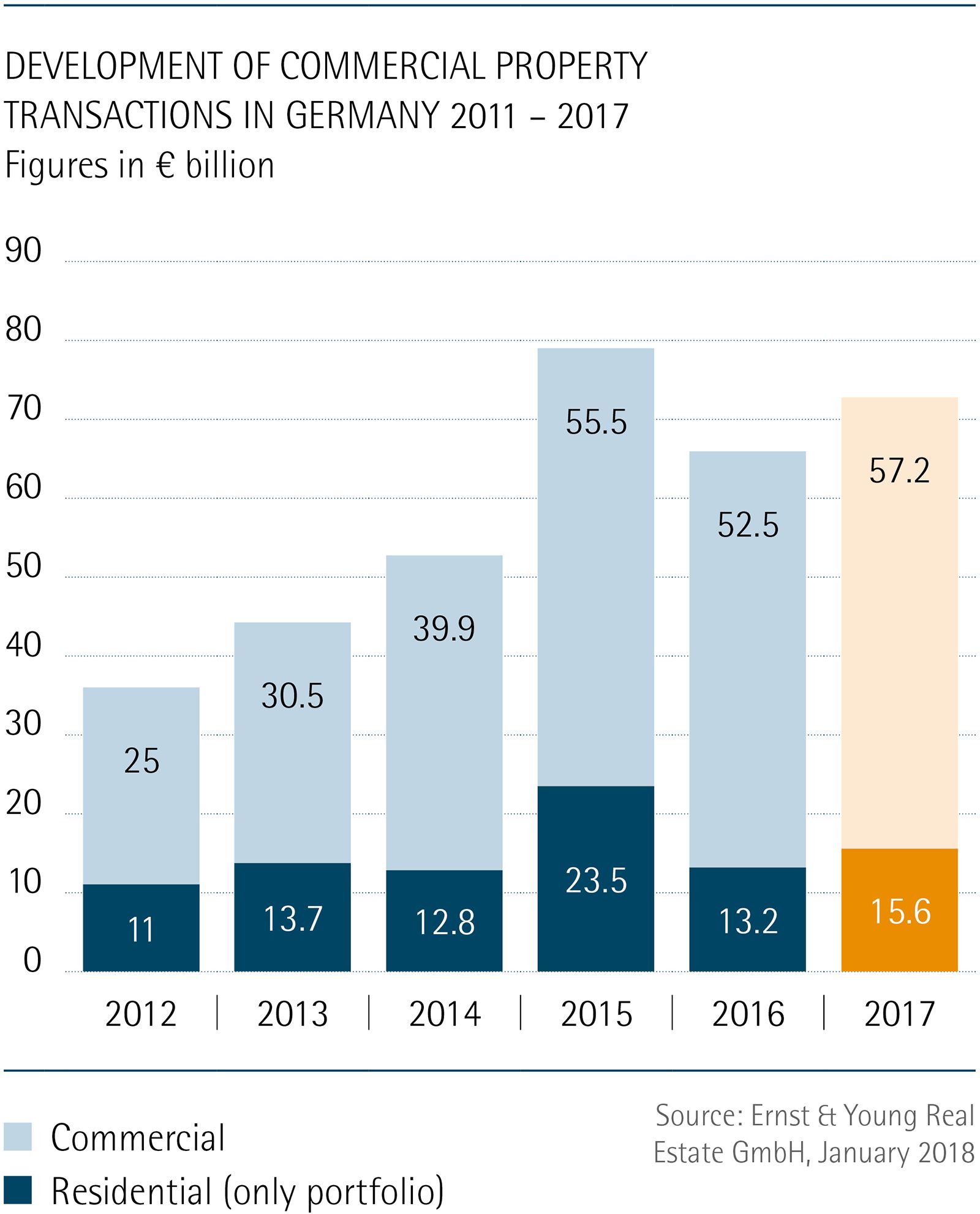 The pronounced increase in prices paid for multi-family houses was driven by high demand shown by institutional investors, which in turn led to a further decline in yields. A total of € 15.6 billion was invested in residential property portfolios in 2017, the third highest amount recorded within the last ten years. This segment of the market remained dominated by domestic investors with foreign buyers only representing 20 percent of the capital invested. Buying activity was focused on the seven biggest cities and major cities with above-average population growth as investors viewed these cities as offering the greatest market liquidity and thus the least risk. The availability of existing properties was tight across Germany. This led to a shift in investors’ buying activities over to projects that were in the developmental stage. As a result, new construction developments represented about 30 percent of the total volume of transactions.