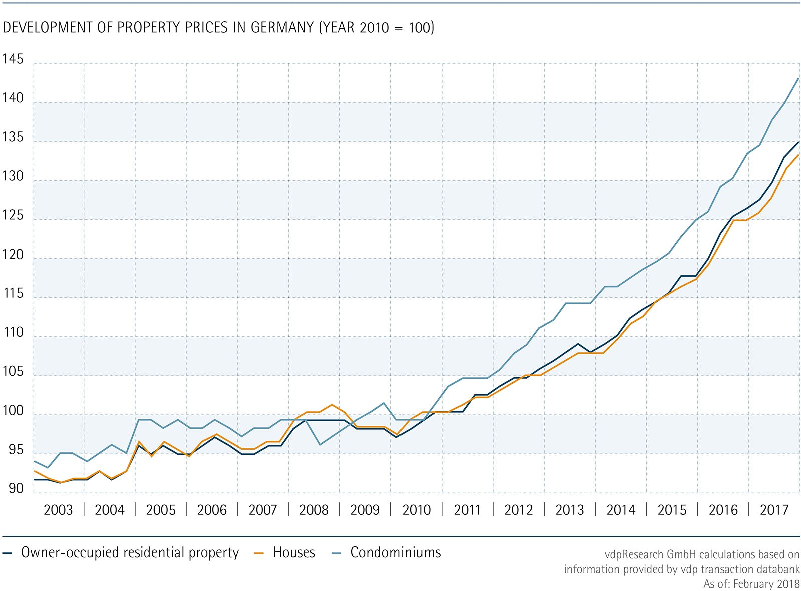The residential property market in Germany was again marked by rising purchase prices and rents in 2017. Prices accelerated even further compared to the previous year rising by 6.9 percent in 2017 according to the Association of German Pfandbrief Banks’ (vdp) index for residential property prices. The strong 5.8 percent rise in prices affected owner-occupied residential property, as well as multi-family houses, which posted an increase of 7.9 percent.