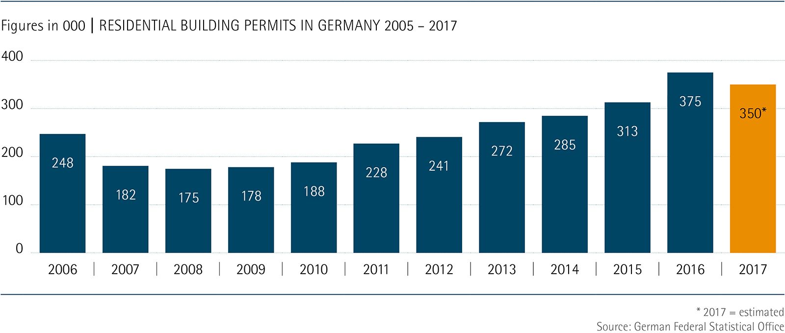 New construction activity noted during the year under review was once again unable to keep pace with the high demand. Although the number of newly built homes has continually increased across the nation since 2010, and set a new 15-year record in 2017 with about 280,000 new housing units, it still lags behind actual housing needs. After taking into consideration various factors – above all migration to and within Germany, smaller households, and the backlog of demand for housing – Germany needs 350,000 to 400,000 new housing units per year.