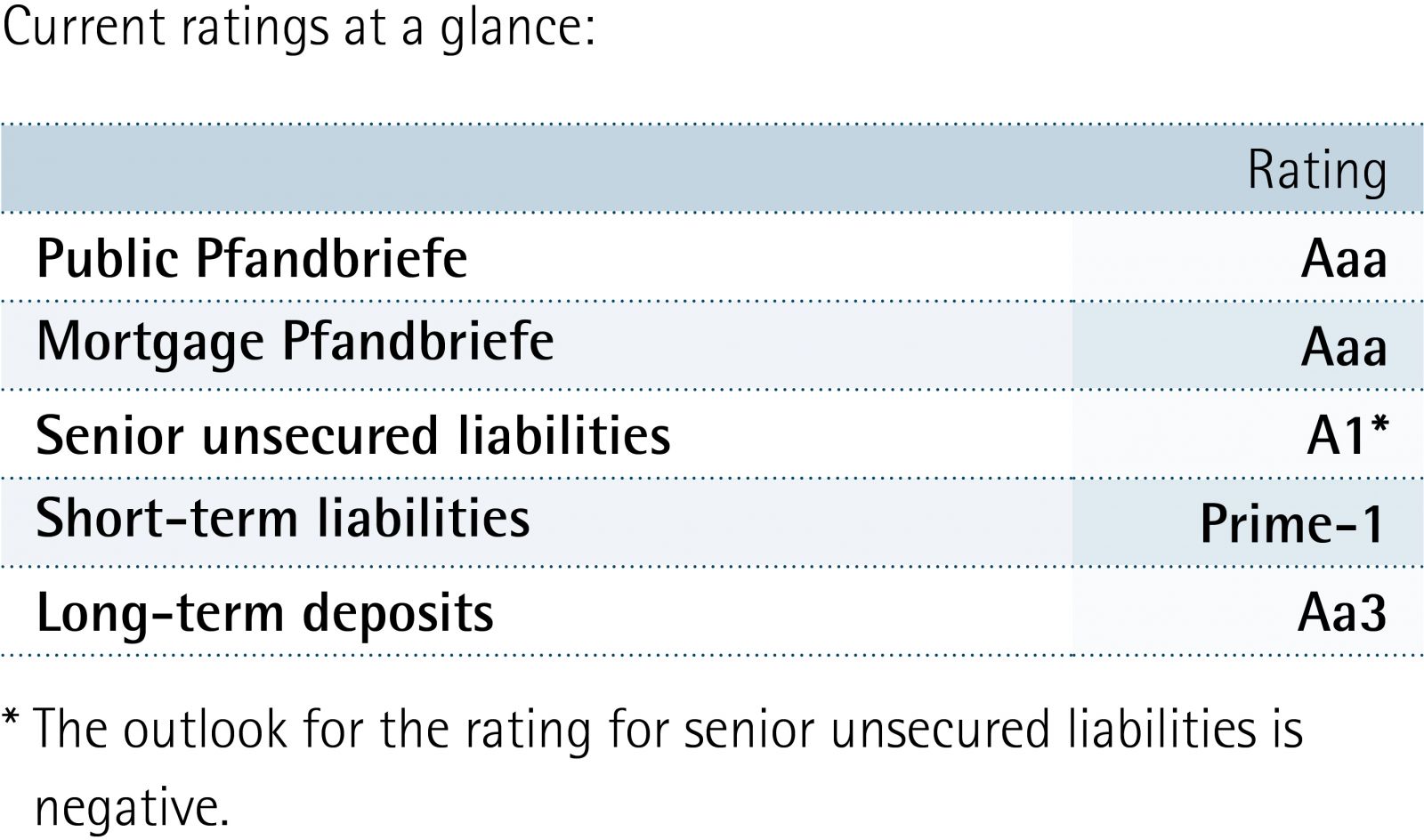 In November 2017 the rating agency Moody’s raised its Baseline Credit Assessment (BCA) for MünchenerHyp to ba1. The BCA corresponds to the standalone rating of a bank. This decision takes various favourable developments of MünchenerHyp’s key figures into consideration. The higher BCA rating was primarily due to the further improvement in the Bank’s level of equity capital, as well as the moderate risks in its loan portfolio.