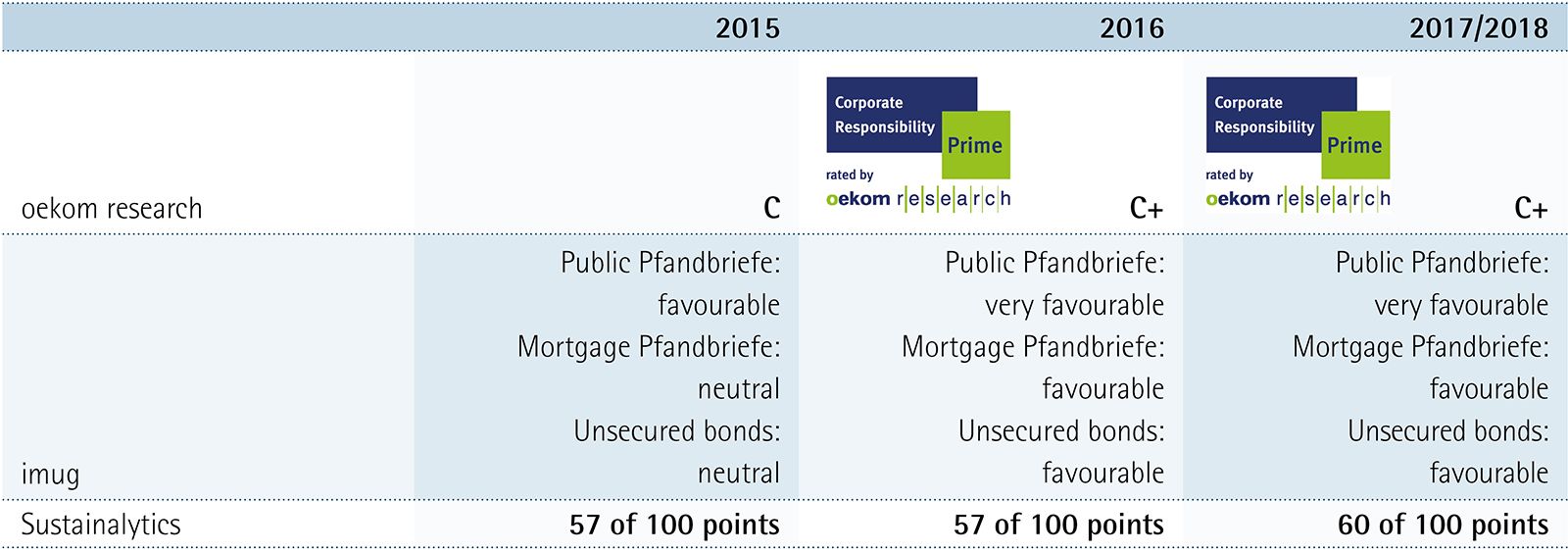 The agency imug confirmed all of MünchenerHyp’s sustainability ratings at the beginning of 2017. The agency issued a “very favourable” rating for our Public Pfandbriefe, and a “favourable” rating for our Mortgage Pfandbriefe and unsecured bonds. The rating for Mortgage Pfandbriefe means that the Bank holds the best rating among the 30 German issuers rated by imug.